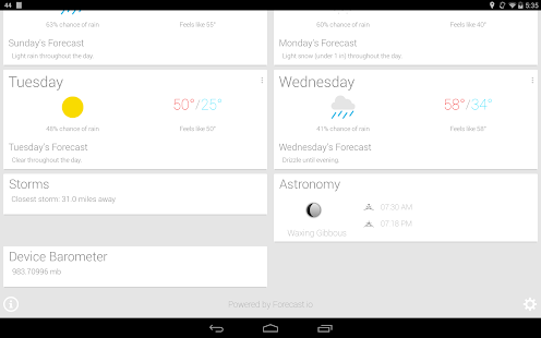 Powered by Forecast.io, and inspired by Google Now, AtmosHere is a twist on your typical weather app. Featuring everything you could ask for in a weather app, current conditions, condition summaries for the next hour, 24 hours, 48 hours, and week, precipitation probability in chart form (Who doesn't love charts?!), along with information for the next week with almost all weather information you could ask for!